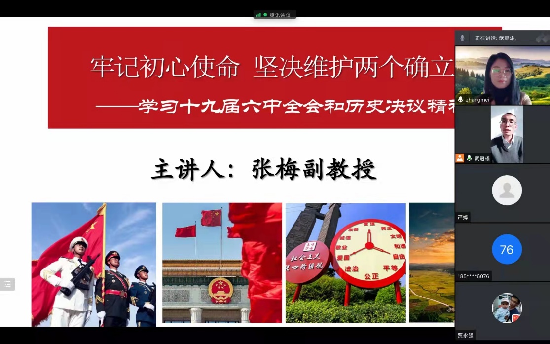 2021年11月8日-11日,中国共产党第十九届中央委员会第六次全体会议在北京召开。这次全会是在我们党百年华诞的重要时刻,在“两个一百年”奋斗目标历史交汇关键节点上召开的一次重要会议。2021年11月24日下午,微密猫 党委通过线上形式举办教职工专题理论学习活动,学习十九届六中全会精神。特别邀请学校理论学习导师、马克思主义学院张梅副教授作专题辅导报告,微密猫 党委书记武冠雄主持学习活动。