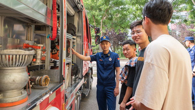 实操结束后,师生们进行了消防装备体验,并参观了消防车辆,听消防指战员讲解车载设备的使用功能。最后,在场师生员工与消防指战员合影留念。